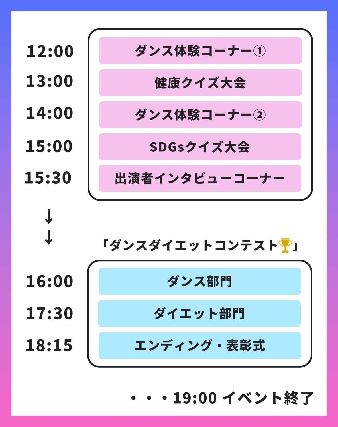 注目のメインイベントは、ダンスダイエットコンテスト!優勝賞金や次回ゲスト出演権をかけ、100名以上の出場者が迫力のダンスパフォーマンスを披露します。 -